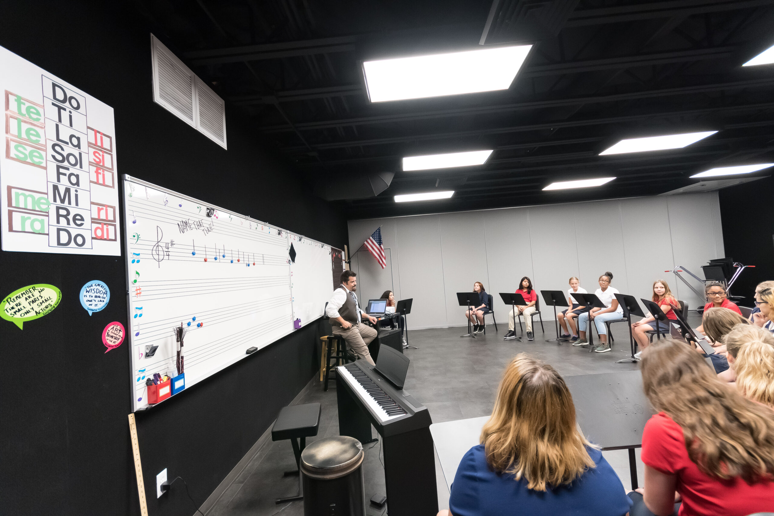 Students learn basic keyboard skills in our state-of-the-art piano labs. Teachers can communicate and provide feedback to each student through headsets, allowing everyone to learn at their own pace.